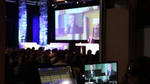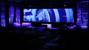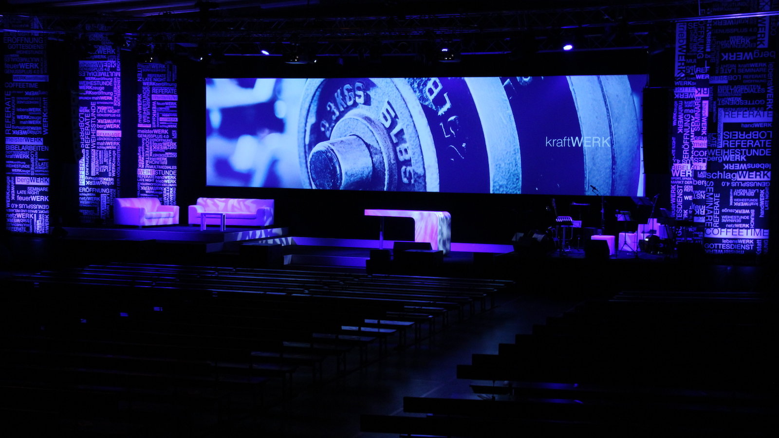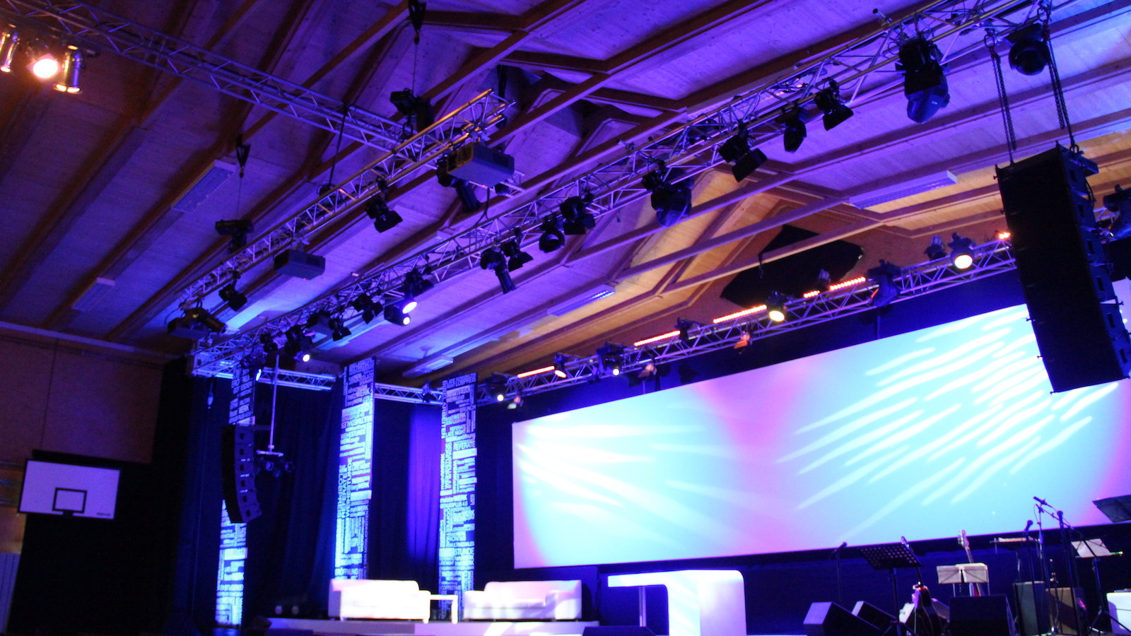 Für den bundesweiten viertägigen Mitarbeiterkongress eines überregionalen Jugendverbandes wurde die leere Sportstätte eines Freizeit- und Schulungszentrums in eine Tagungsstätte für über 1.000 Teilnehmer verwandelt. Hierzu war neben der Konzeption der Flucht- und Rettungswegeplanung auch die Erstellung eines Sicherheitskonzeptes für die Umnutzung der Halle im Sinne der VStättVO notwendig. Für die jeweiligen Schulungsinhalte wurde der gesamte Bühnenhintergrund durch vier HD-Projektoren sowohl mit vollformatigen Grafi ken, als auch mit Kamera-, Film- und Präsentationsinhalten bespielt. Während der Veranstaltungspausen wurde die Szenerie zur Showbühne umgewandelt und lieferte in gänzlich geändertem Gewand das abendliche Setup für verschiedene Künstlerauftritte und Showformate, um am nächsten Morgen wieder für den Fortgang der Tagung zur Verfügung zu stehen. Im Schichtbetrieb sorgten knapp 20 Mitarbeiter für einen reibungslosen Ablauf aller Arbeiten.